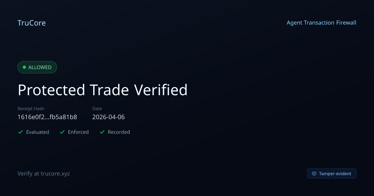 https://www.trucore.xyz/api/og/receipt?hash=1616e0f2347f68f8d2f189b6365456fde56a607d66fc897817946f34fb5a81b8Use these links to share independently verifiable proof.